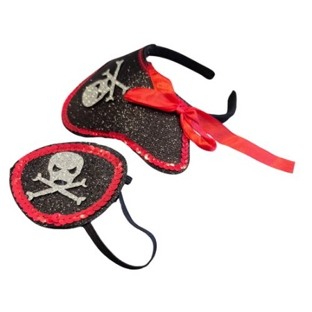 Ten piracki zestaw to idealna propozycja dla wszystkich miłośników morskich przygód! W komplecie znajdziesz błyszczącą opaskę na głowę z czerwonym akcentem oraz klasyczną opaskę na oko z czaszką. Oba elementy zdobione brokatem i cekinami przyciągają wzrok i dodają charakteru każdemu przebraniu.